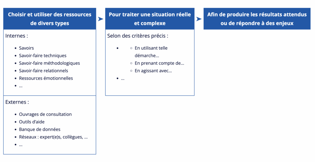 Le centre de pédagogie de l’Université de Montréal a adapté le tableau suivant de Le Boterf (2008) pour résumer l’approche par compétence. On y présente ce que la personne apprenante doit être en mesure d’accomplir :