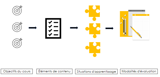 Les objectifs généraux et spécifiques d’un cours devraient constituer un point de départ à la réflexion pédagogique en ce sens qu’ils seront à l’origine des contenus à enseigner, des activités d’apprentissage à faire vivre et des modalités d’évaluation identifiées pour réguler et évaluer les apprentissages. En d’autres mots, les objectifs d’apprentissage sont les premiers jalons de la réflexion sur la cohérence d’un cours, le point de départ pour l’alignement pédagogique de celui-ci.