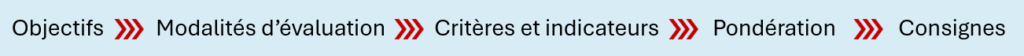 À partir des objectifs spécifiques, on établit les critères d’évaluation. Les critères d’évaluation précisent le plus clairement possible comment chaque objectif devrait se manifester dans la tâche demandée. Par exemple, si, dans un cours d’informatique, un des objectifs spécifiques est de programmer un algorithme simple et que la tâche est de coder, les critères d’évaluation pourraient être :